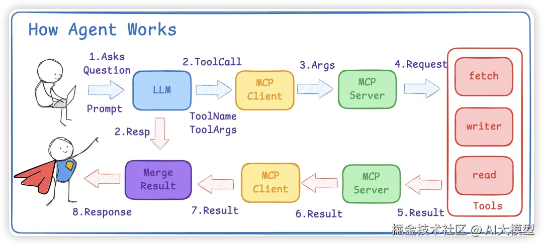 Agent智能体,我们上面说了大模型只会给我们一个步骤方法 ,不会真正去执行步骤。比如发邮件,大模型只会给出如何发邮件,第一步xxx,第二步xxx。并不会实际帮我们去发邮件,而我们需要把 LLM 整合上 MCP 工具才会真正实现发邮件。