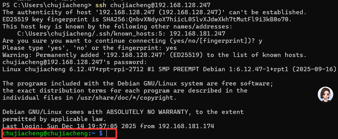 bash# SSH(Secure Shell):安全的远程登录协议,用于加密连接树莓派 # 命令格式:ssh [用户名]@[目标设备IP] # chujiacheng:树莓派系统中已创建的合法登录用户名(需确保该用户存在) # 192.168.128.247:树莓派在局域网内的IP地址(注意:该IP与之前的192.168.181.247不同,需确认树莓派实际IP) # 执行该命令后,终端会提示输入chujiacheng用户的密码,验证通过即可进入树莓派的命令行界面 ssh chujiacheng@192.168.128.247成功示例: