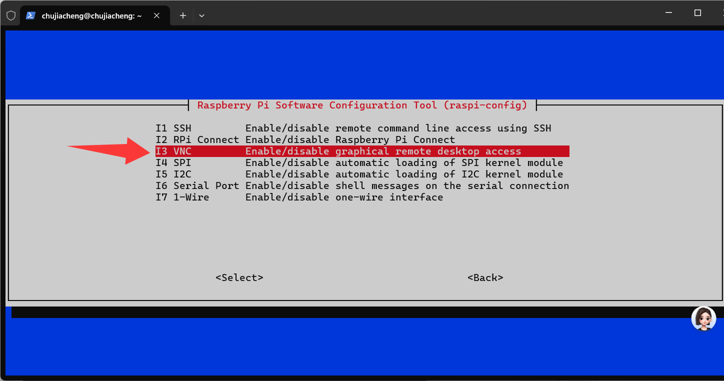 sudo raspi-config,回车;配置VNC:在弹出的蓝色配置窗口中,用方向键选择"Interface Options",回车;然后选择"VNC",回车;在确认窗口中选择"Yes",回车;