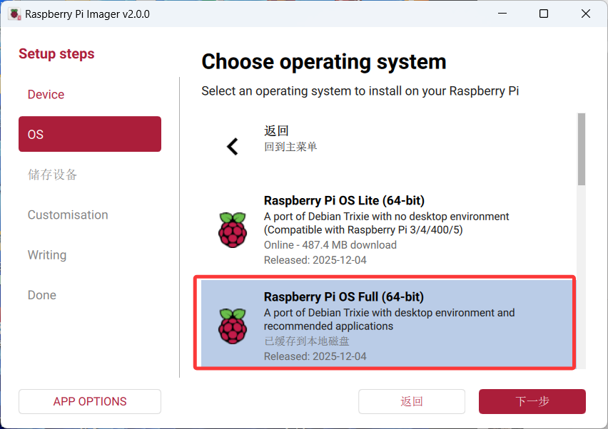 选择系统镜像:打开Imager后,点击"Device",在弹出的列表中找到Raspberry Pi OS Full(64-bit).