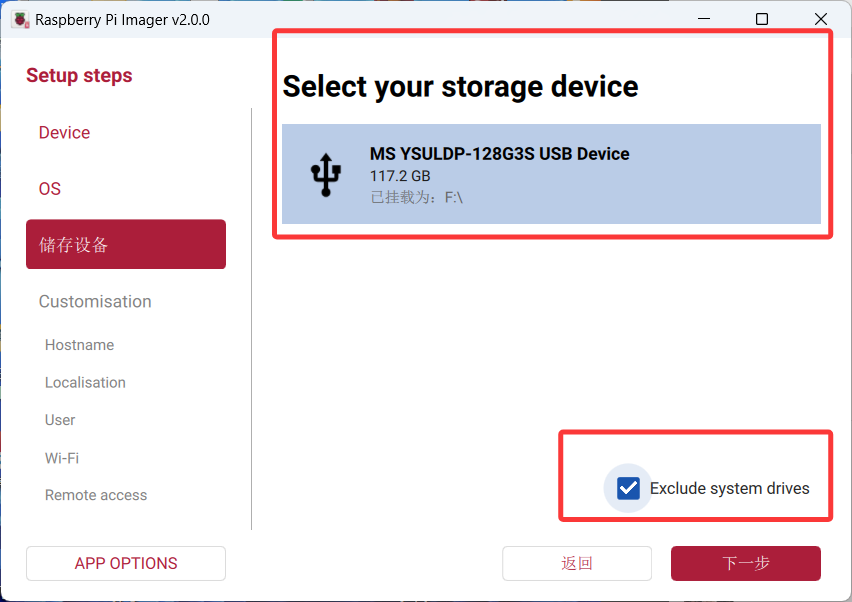 选择SD卡:点击"选择存储设备",在列表中找到自己的SD卡(注意:不要选错,否则会格式化其他磁盘!);
