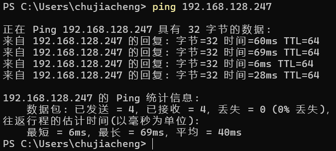 bash# ==================== 网络连通性测试 ==================== # ping命令用于测试本地主机与树莓派之间的网络是否连通 # 192.168.181.247 是树莓派的局域网IP地址 # 执行后会持续发送数据包并返回响应,按 Ctrl+C 终止测试 ping 192.168.181.247 # ==================== SSH远程登录 ==================== # ssh命令用于通过SSH协议远程登录树莓派 # 格式:ssh 用户名@目标IP # chujiacheng:树莓派系统中已创建的用户名(需确保该用户存在) # 192.168.181.247:树莓派的局域网IP地址 # 执行后会提示输入该用户的密码,验证通过后即可进入树莓派的命令行界面 ssh chujiacheng@192.168.181.247连接成功示例: