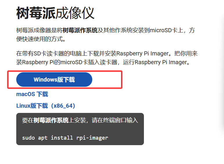 树莓派官网 **Raspberry (https://www.raspberrypi.com/树莓派官网),**选择Windows下载,然后双击文件直接安装。