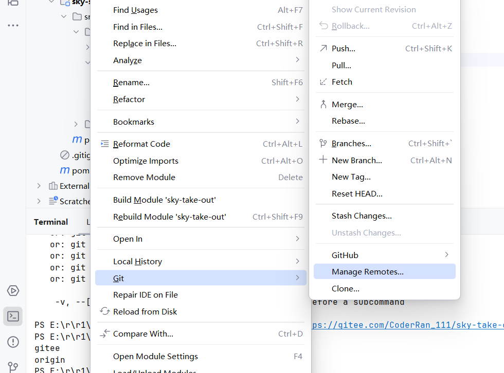 git remote add gitee https://gitee.com/CoderRan_111/sky-take-out.git
