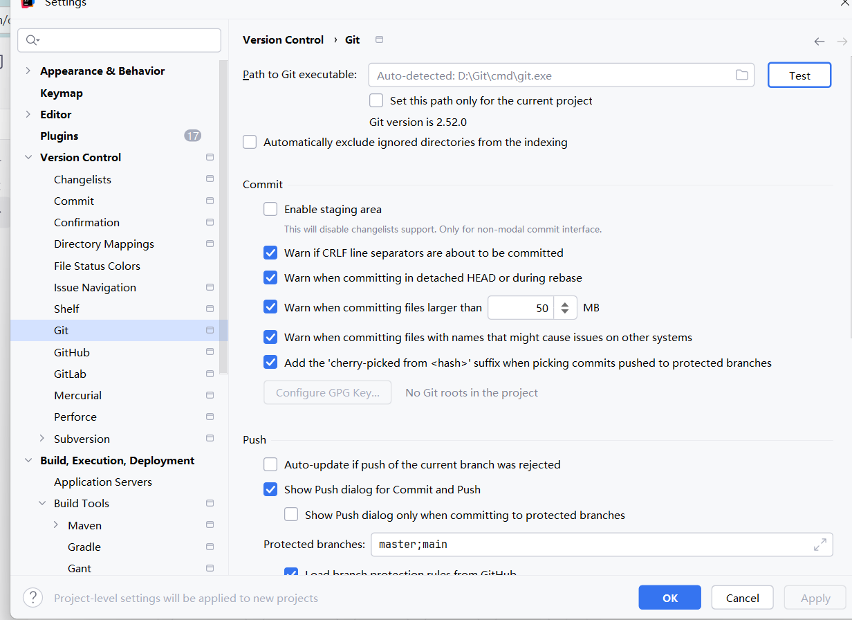 找到idea的全局设置,选择Version Control下的Git,选择你的git.exe文件,点击Text若下方出现Git版本号则配置成功