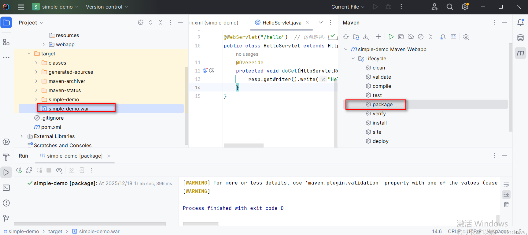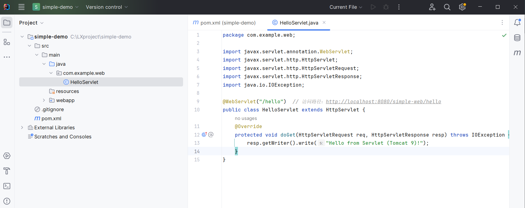 HelloServlet.java:javapackage com.example.web; import javax.servlet.annotation.WebServlet; import javax.servlet.http.HttpServlet; import javax.servlet.http.HttpServletRequest; import javax.servlet.http.HttpServletResponse; import java.io.IOException; @WebServlet("/hello") // 访问路径:http://localhost:8080/simple-web/hello public class HelloServlet extends HttpServlet { @Override protected void doGet(HttpServletRequest req, HttpServletResponse resp) throws IOException { resp.getWriter().write("Hello from Servlet (Tomcat 9)!"); } }- 注意 :Tomcat 9 使用