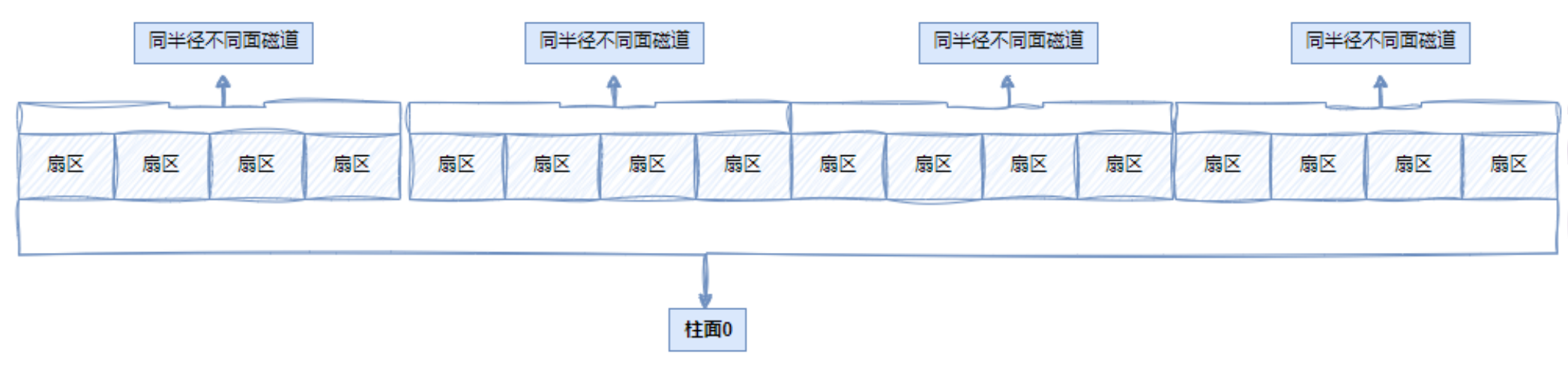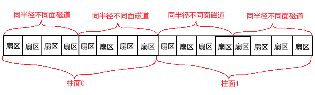 柱⾯是⼀个逻辑上的概念,其实就是每⼀⾯上,相同半径的磁道逻辑上构成柱⾯。所以,磁盘物理上分了很多⾯,但是在我们看来,逻辑上,磁盘整体是由"柱⾯"卷起来的。