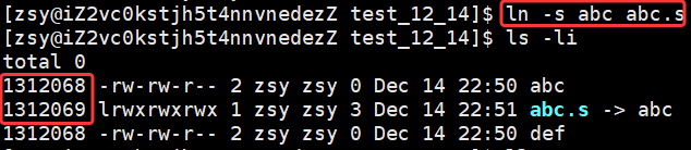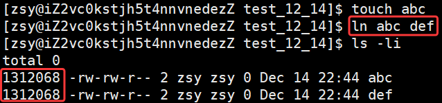 举例:给已存在的文件 abc 新增一个硬链接 def。