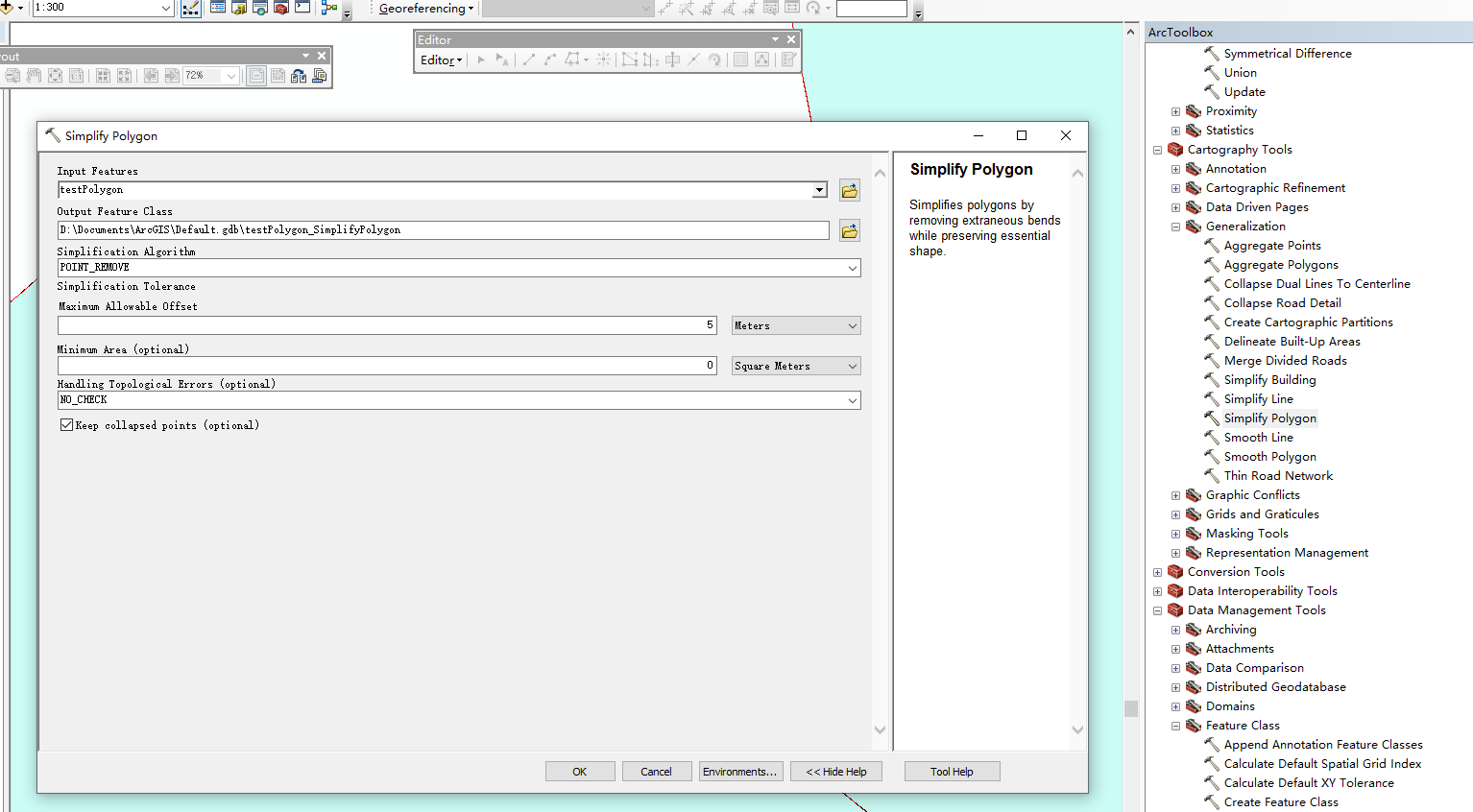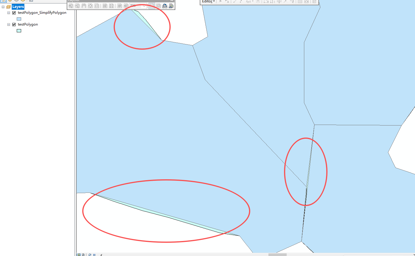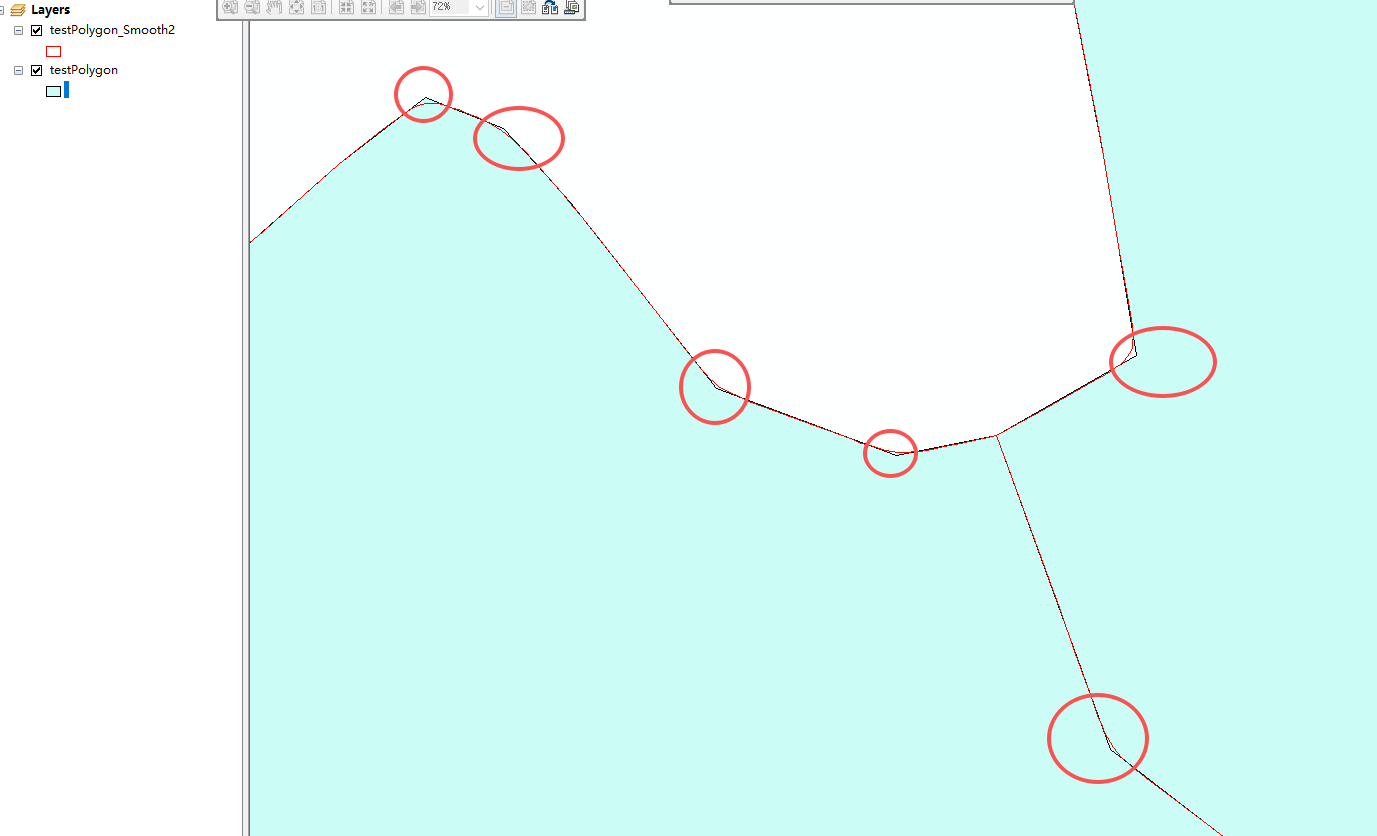 二、开始:直接使用arcmap的面平滑工具。平滑后的面与面交接处出现裂缝,边线条也比较粗糙。结果如下