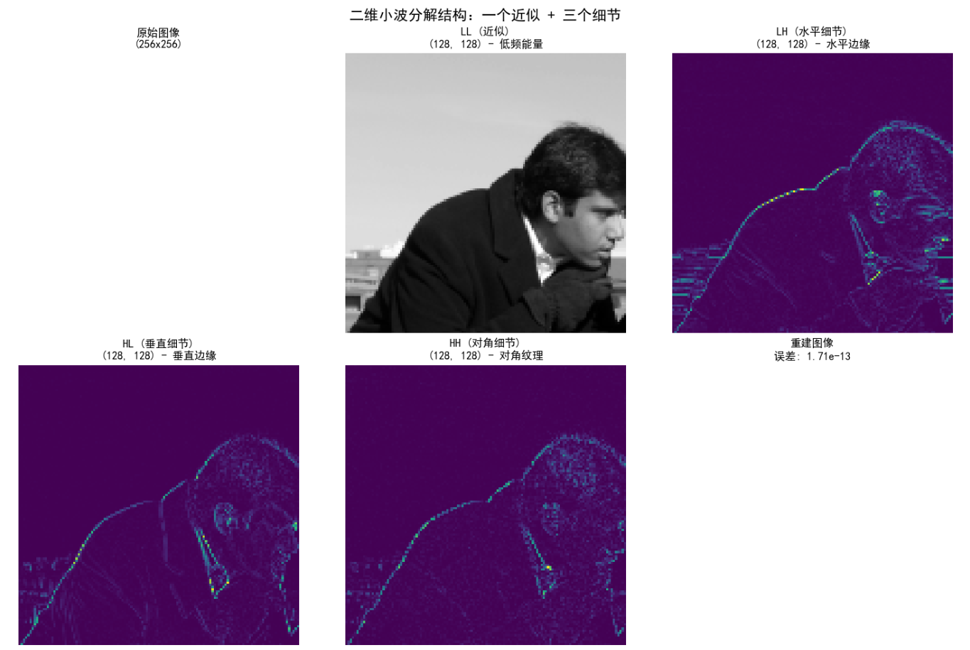 - 2x3网格:原图、四个子带、重建图。误差接近0。