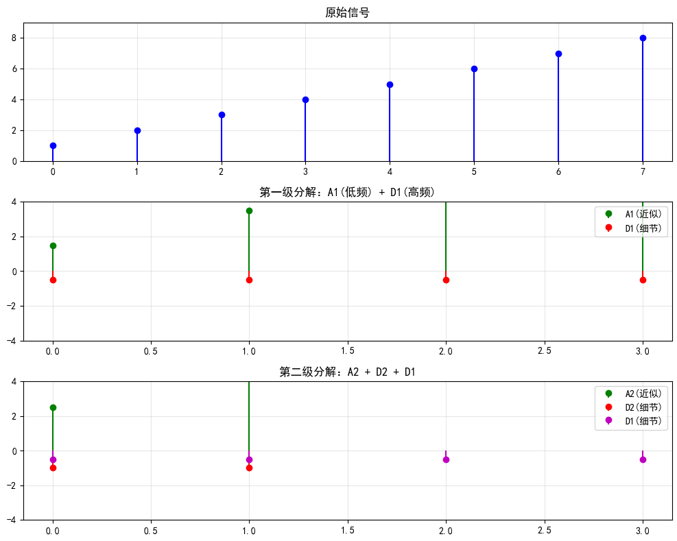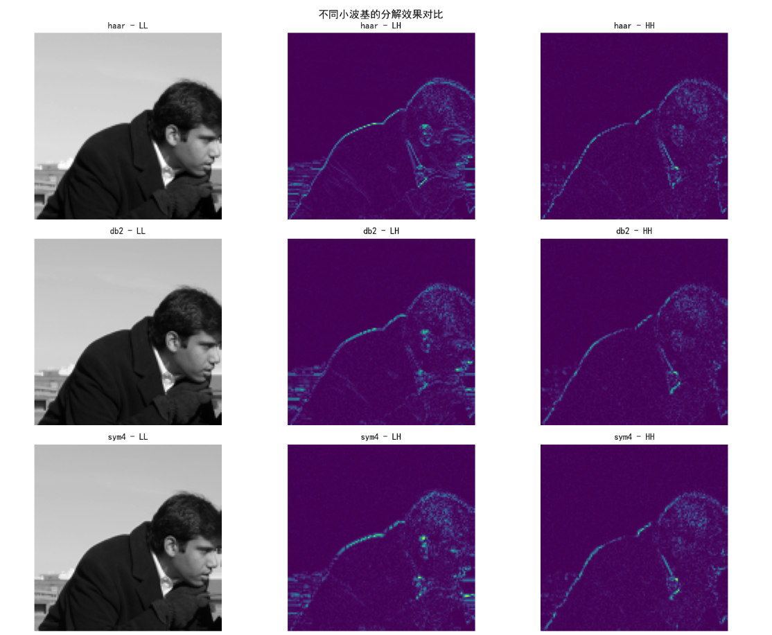pywt.wavedec2),并可视化所有子带。预期:更多子带,如LL2, LH2等。 - 应用题 :用小波变换对一个含噪信号去噪(阈值细节系数)。写代码并绘制去噪前后对比。提示:用