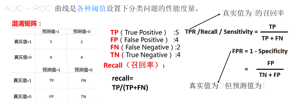 - TPR(召回率):实际正类中被正确预测为正类的比例 → TPR=TP+FNTP;