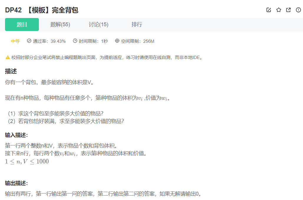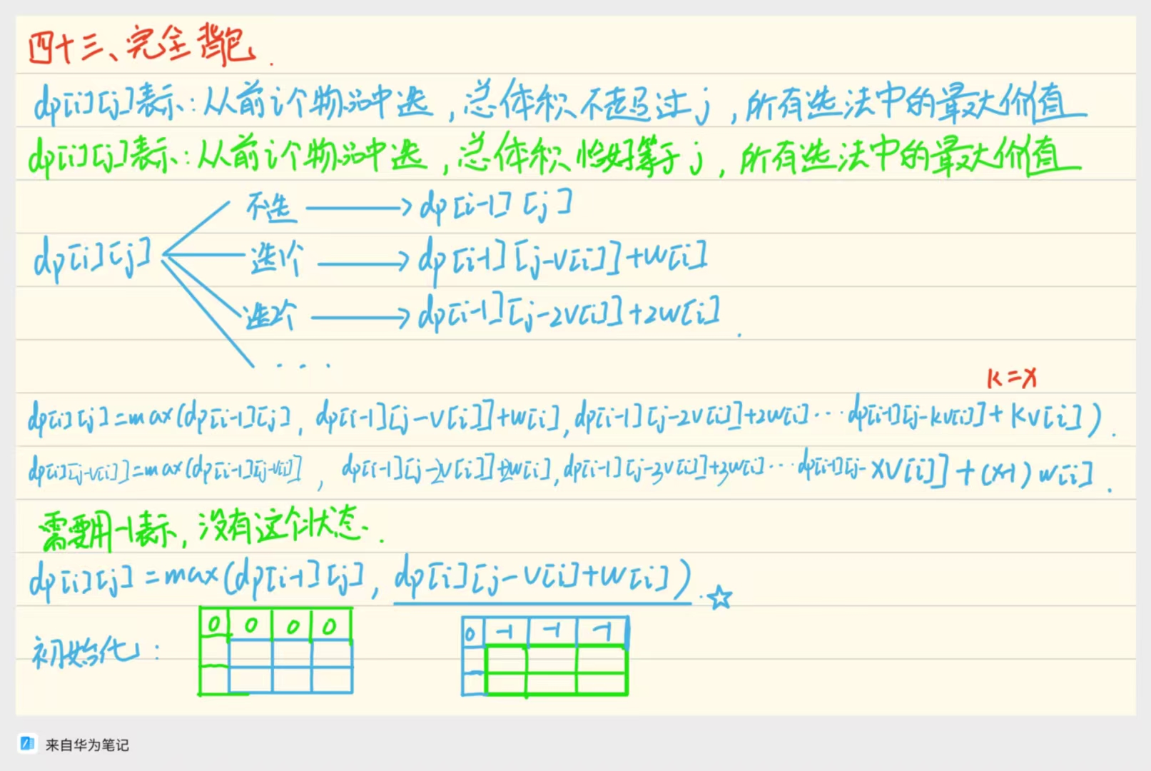 - 这里主要区分与01背包的是dp[i][j] = max(dp[i][j], dp[i][j - V[i]] + W[i])表达式;这里01背包中是dp[i][j] = max(dp[i][j], dp[i-1][j - V[i]] + W[i]);因为完全背包和01背包的本质区别是01背包中物品都只有一个,然而完全背包中物品确实可以任意多个;所以以我的话来讲就是在01背包中,你选了当前物品,就不能再次选择了,就只能去前i-1个物品中找合适的选项;在完全背包中,你选了当前物品,还可以再次选择了,就可以再去前i个物品中找合适的选项;