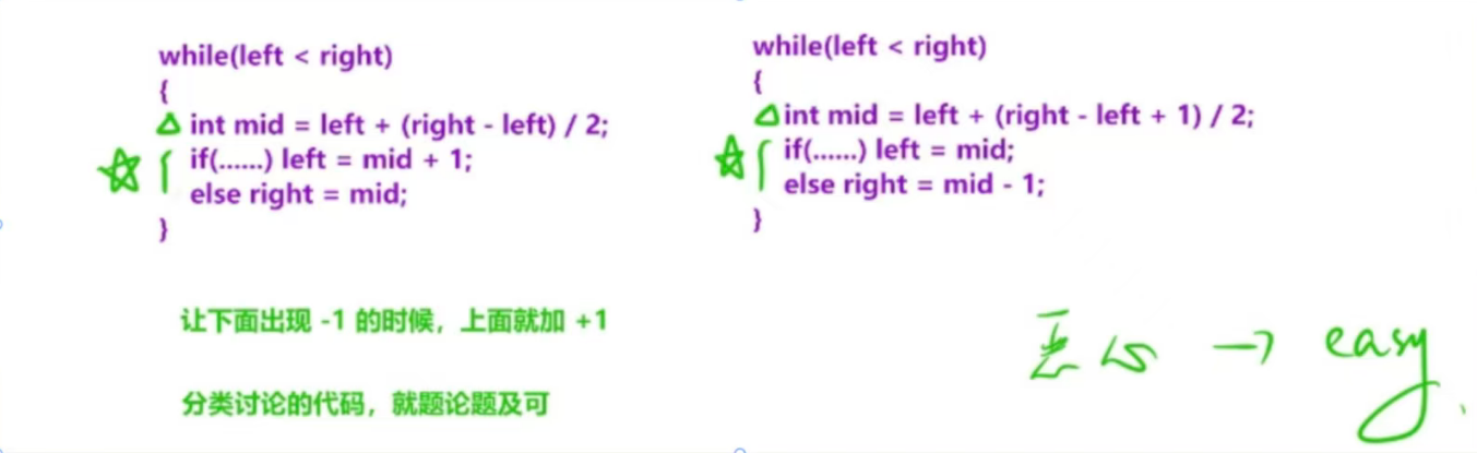 ①left=mid+1,right=mid//②left=mid,right=mid-1