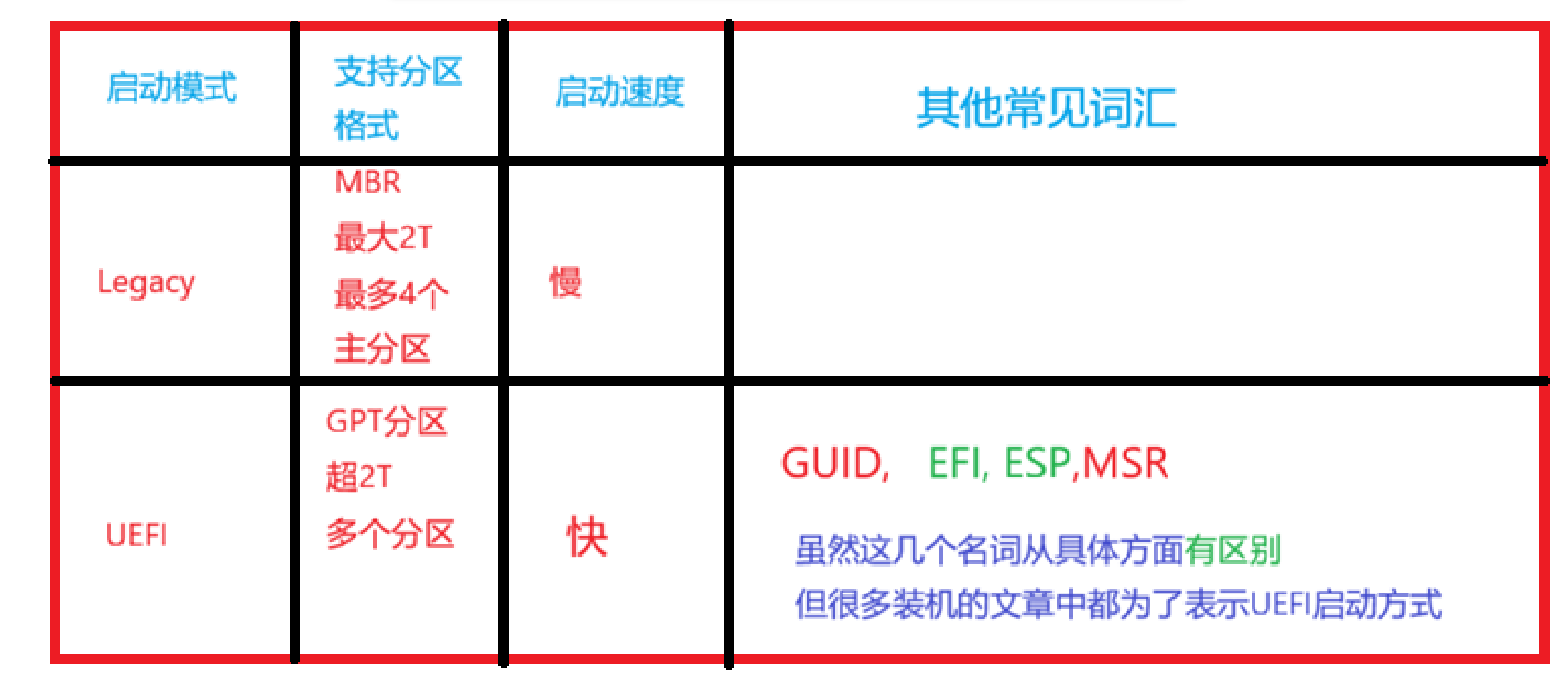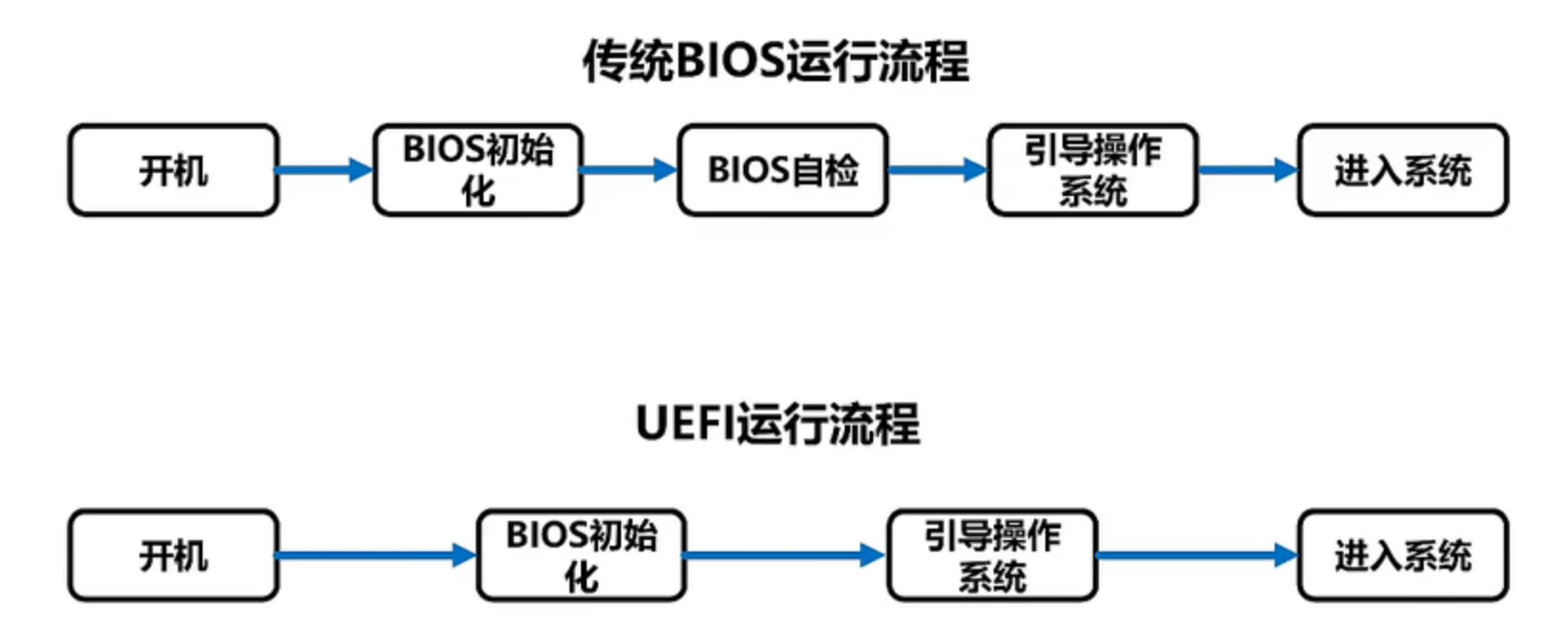 下面这图中就是把传统bios和uefi分为两种,实际就是legancy启动和UEFI启动。 而多了一步BIOS自检使得legancy的启动方式更快开机。