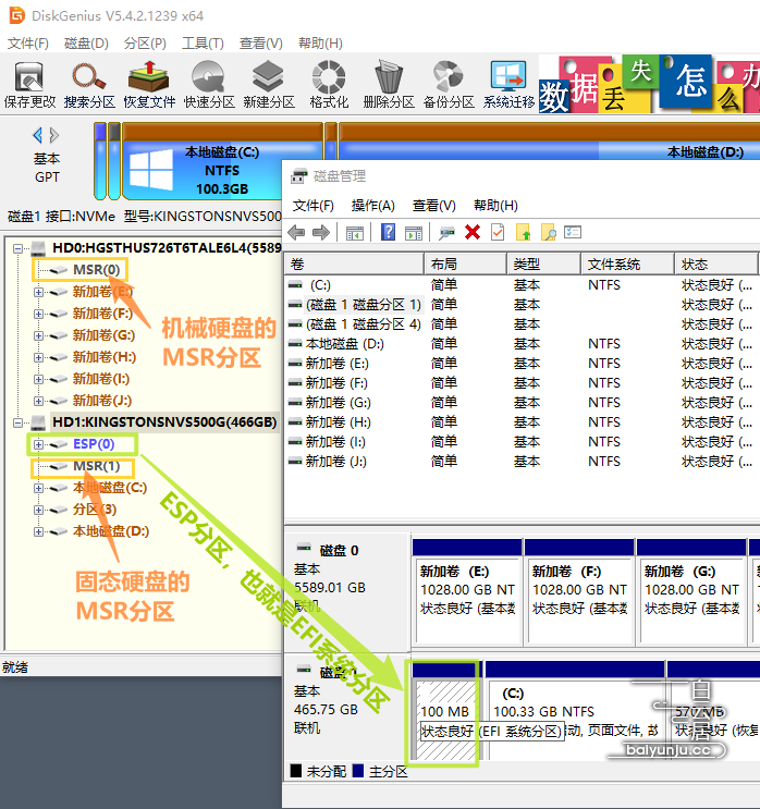 图片来源,不同硬盘中显示不同,MSR都会显示,在机械硬盘中不显示ESP ,