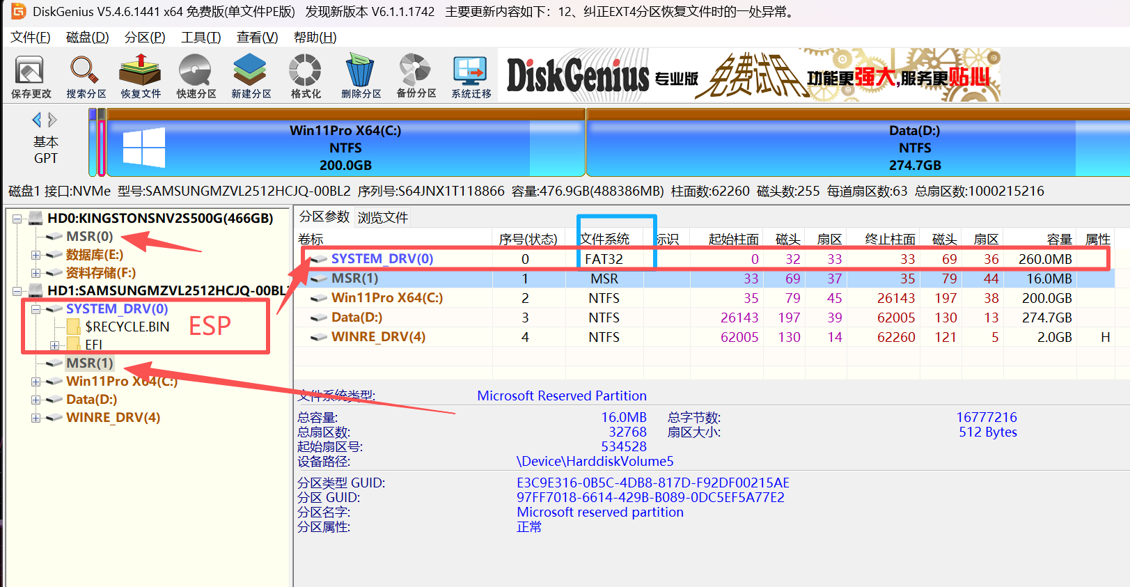 1,不同存储盘,只有系统盘有ESP(EFI) ,也就是引导 2,每个存储盘都有MSR分区 3,MSR大小16MB 4,ESP/EFI:文件系统是FAT32