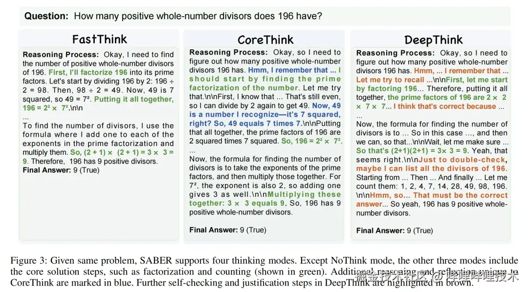 通过 MATH500 的示例可见,各模式都会遵循核心解题步骤,但推理深度有所区分: