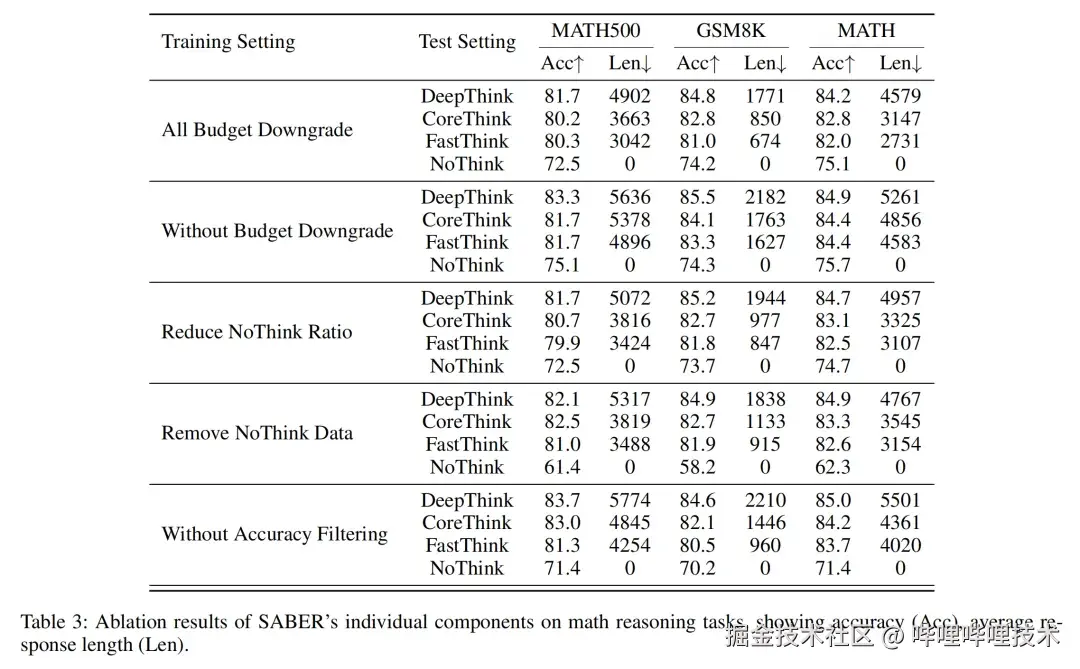 我们对 SABER 的核心设计逐项去除并测试其影响,包括预算降级策略、NoThink 示例比例、样本准确率过滤等。实验表明:
