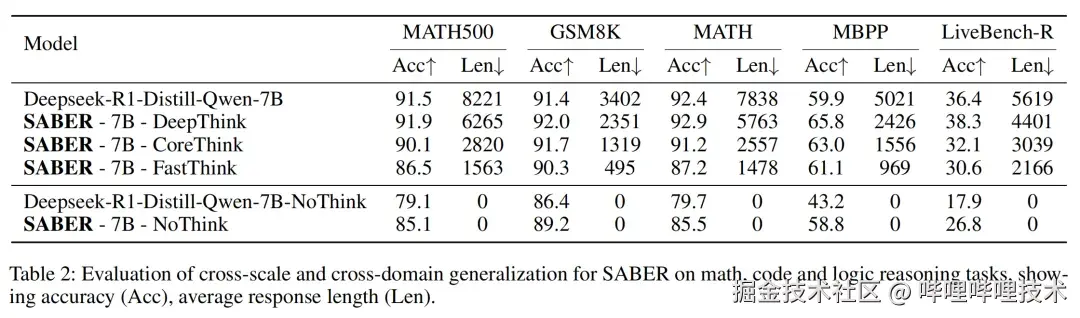 在应用于 7B 模型时,SABER 仍保持良好的推理压缩能力与准确率增益: