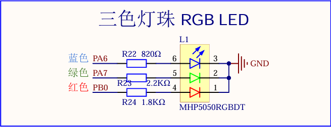 查看一下原理图,发现他只有一个LED,但是是个三通道的分别连接PA6,PA7和PB0。
