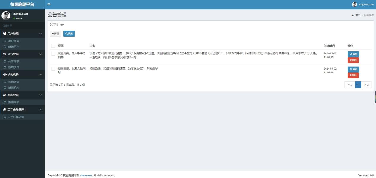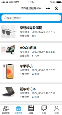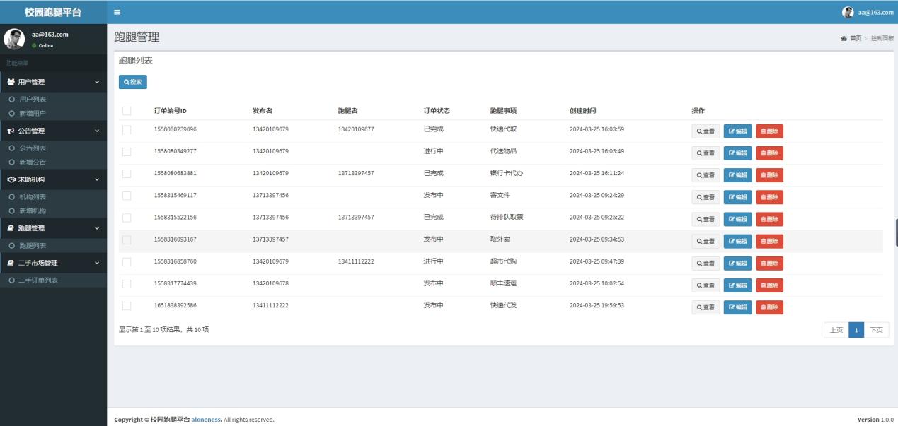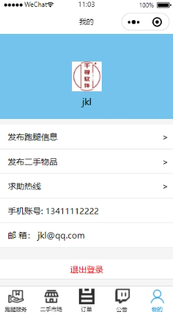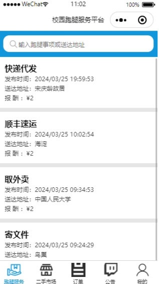 (2)用户:用户用户在登录后,用户可自行查看跑腿信息、二手市场、管理订单信息、查看公告信息、并管理个人中心。