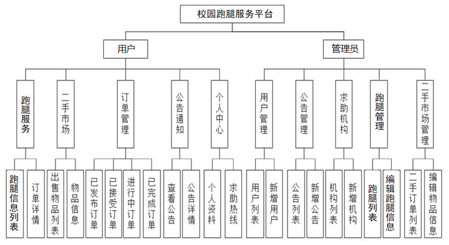 (1)管理员:管理员负责维护网站正常秩序。管理员在登录后,管理用户信息、跑腿信息、管理求助机构、公告信息和二手市场。