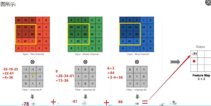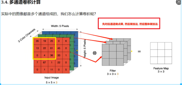 我们进行计算机视觉项目的时候,常常使用的是彩色图像,也是通常说的RGB图像,它有三个通道,所以在进行卷积计算的时候,它所对应的卷积核也有三个通道,每个通道与对应的卷积核进行点乘结果,然后将结果进行求和,输出到新的特征图上,也是将通道数进行了压缩,从原有的三通道变为了1通道。