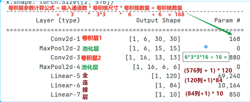 从上图的输出中可以看出在池化层是没有参数的,这里的参数不是指没有参数传递或者填入,这里的参数指的是权重和偏执这些参数,在池化层中的池化核以及步长是确定的,且池化层的池化操作进对于特征图上的数值进行操作,对于权重W与偏置b是没有影响的,所以在池化层是没有偏置的。