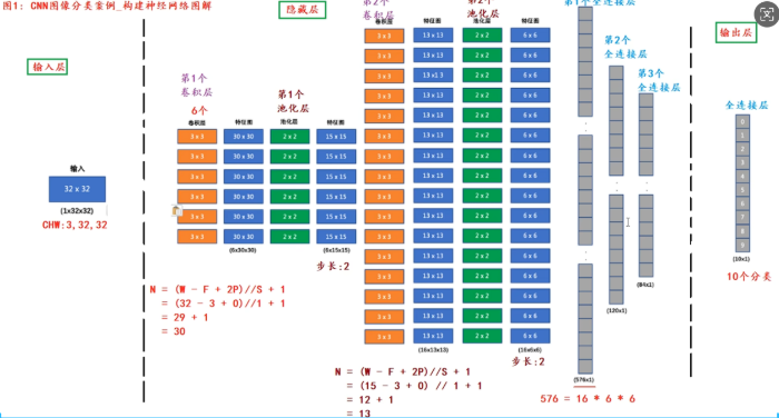 CNN的主要结构为 输入层,隐藏层 和输出层,主体架构主要体现在隐藏层中的网络,依次为卷积层 池化层 然后全连接层直接输出。CNN分别进行了两场卷积和池化 ,最终通过三个全连接层进行输出。