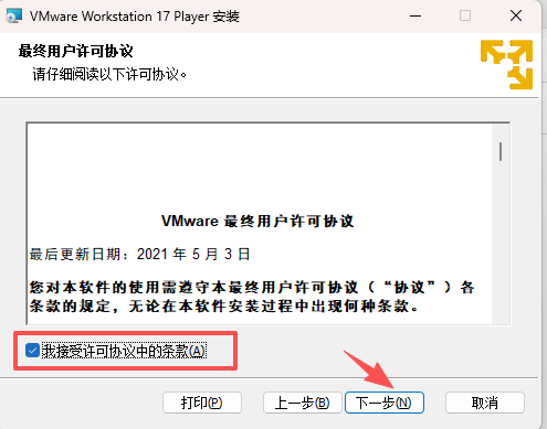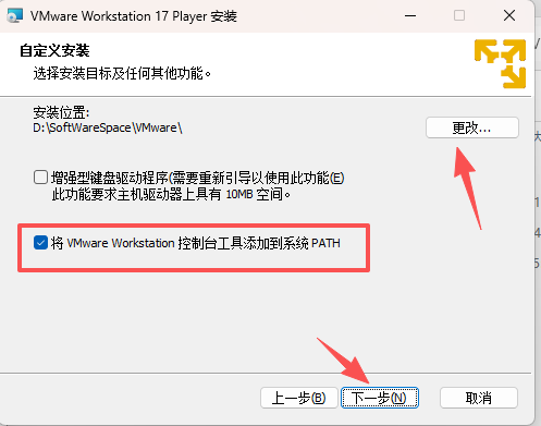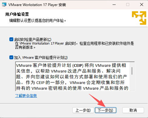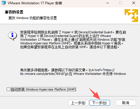 - 可以按情况勾选,然后点击下一步(启用 WHP 可以提高虚拟化性能,并使虚拟机能够使用硬件加速功能,如果系统支持 WHP,并且你希望获得最佳性能和兼容性,建议勾选此选项进行安装,如果你只打算使用 VMware Workstation 基本功能,或者在特定情况下,可以选择不勾选此选项)
