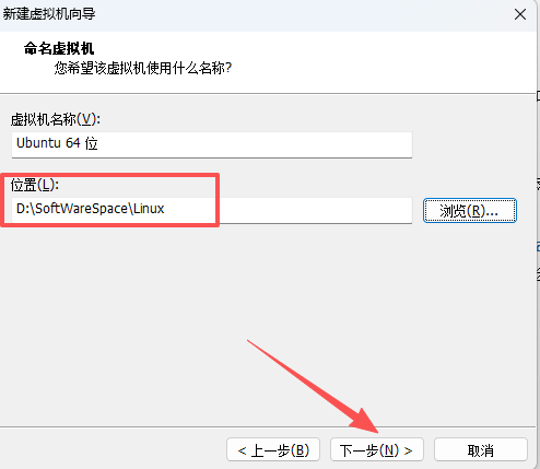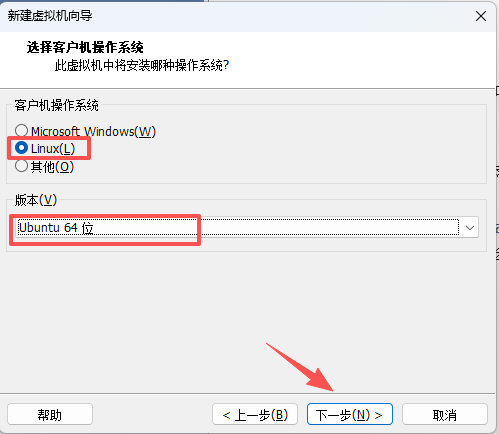 - 选择linux操作系统,ubuntu64位,点击下一步