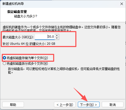 - 根据需求选择最大磁盘大小,选择存储为单个文件,点击下一步