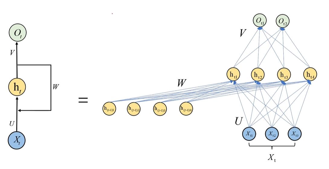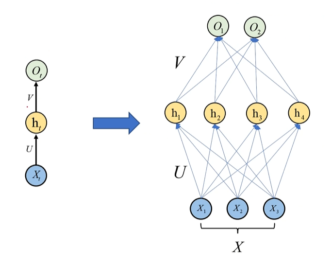 将右边这个的隐藏层展开(隐藏层会有多个神经元,不能老把它看做只有一个神经元),那其实不就是全连接神经网络了吗,U就是W1,V就是W2