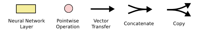 在上图中,每条线承载一个完整的向量,从一个节点的输出到其他节点的输入。粉色圆圈代表点数运算,如向量加法,黄色方框则是学习后的神经网络层。合并行表示串接,而行分叉表示内容被复制,且复制到不同位置。