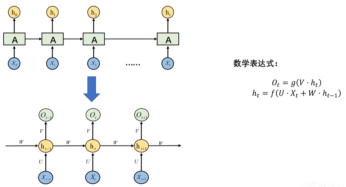 将左边这个循环神经网络的隐藏层打开,过程就是 ht = 激活函数( U*Xt + ht-1*W ),Ot = 激活函数(ht * V)(其实有没有感觉有点像递归)