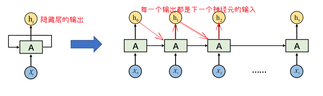 这是RNN的基本结构 ,相比于其他,它为什么可以提取到时间的信息呢?我们全连接神经网络,里面的X特征值是全部一起输入的,而这里的Xt,或者说X1,X2,X3,它是有时间顺序的,X1先输入,X2再输入,并且X1得到的h1,会作为参数传入X2的神经元中。因此,虽然是按顺序来的,但是后面的神经元依旧包含前面神经元的时间信息。