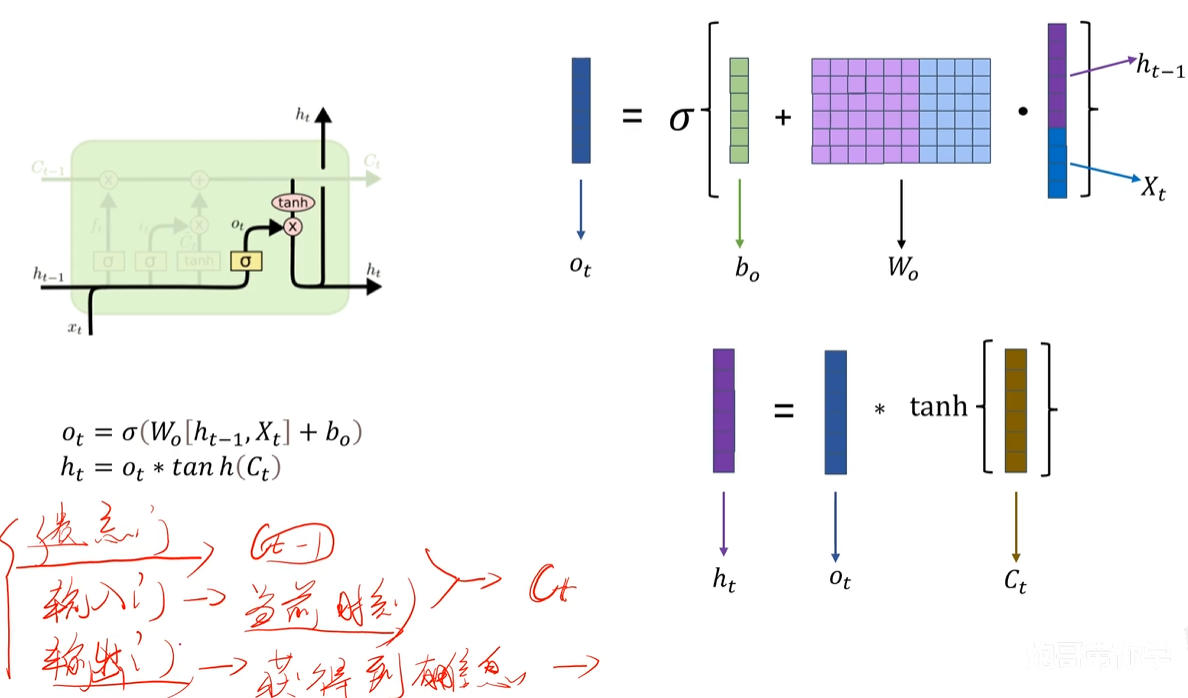 Ot依然再做保留有用信息的比例,而ht就是要输出这一层的结果了,Ct里面保留的是前面所有有用的信息,然后激活函数之后,×上信息的保留比例,最后输出ht