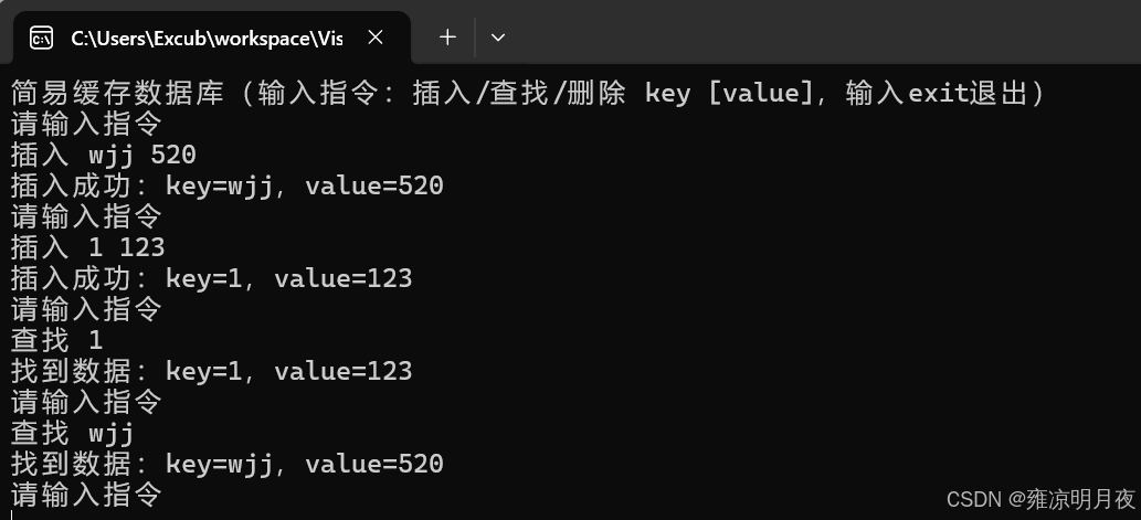cout << "简易缓存数据库(输入指令:插入/查找/删除 key [value],输入exit退出)" << endl;