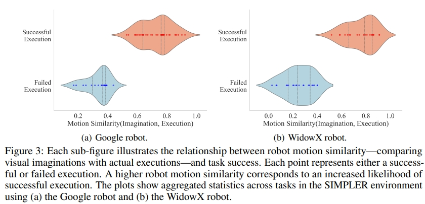 - 运动相似度分析显示,当视觉想象与实际执行的 keypoint 轨迹相似度高于 0.6 时,任务成功率超过 80%,验证了 "视觉想象引导动作规划" 的有效性。