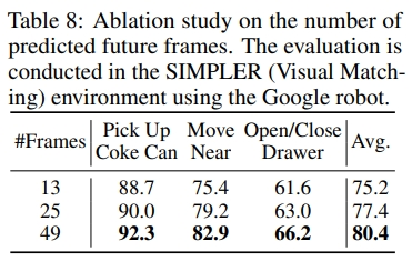 | 预测帧数量 | 49 帧(80.4%)优于 25 帧(77.4%)和 13 帧(75.2%),更长时间视野提升动作规划准确性 |