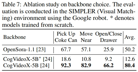 | 预训练 backbone | CogVideoX-5B 预训练模型(80.4%)比从零训练(12.6%)性能提升 6 倍,证明视频生成模型预训练知识的价值 |