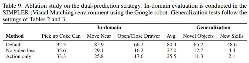 | 双预测策略 | 仅预测动作(25.5%)或无视频损失(27.0%)时,泛化能力大幅下降,验证双目标协同的核心作用 |