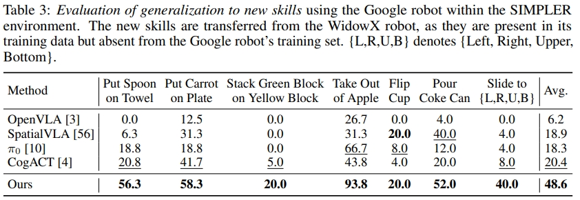 将 WidowX 机器人的 8 种未训练技能(如 "倒液体""滑动物体")迁移到 Google 机器人,VideoVLA 平均成功率 48.6%,比第二名 CogACT(20.4%)高出 28.2 个百分点,甚至能完成 "翻转杯子""擦拭桌面" 等差异较大的技能。