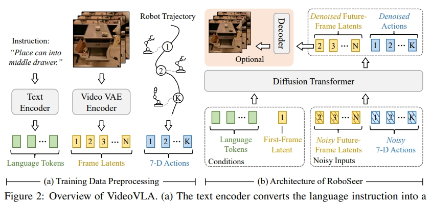 - 通过 DDPM 扩散损失函数,联合对未来视频 latent 和动作序列进行去噪训练,确保两者语义与物理一致性。