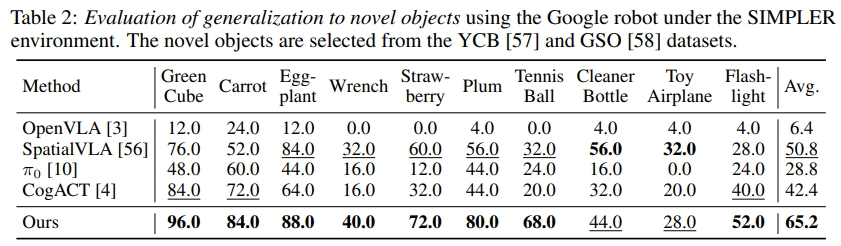 在 YCB 和 GSO 数据集的 10 种未训练物体(如扳手、玩具飞机、手电筒)上,VideoVLA 平均成功率 65.2%,在 8 种物体上排名第一,远超 OpenVLA(6.4%)、SpatialVLA(50.8%)。