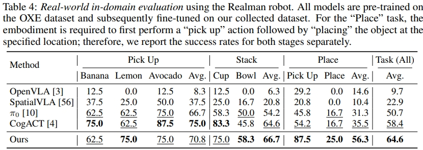 - 真实世界实验中,Realman 机器人 "放置" 任务平均成功率 56.3%,显著高于 OpenVLA(14.6%)、SpatialVLA(10.4%)。