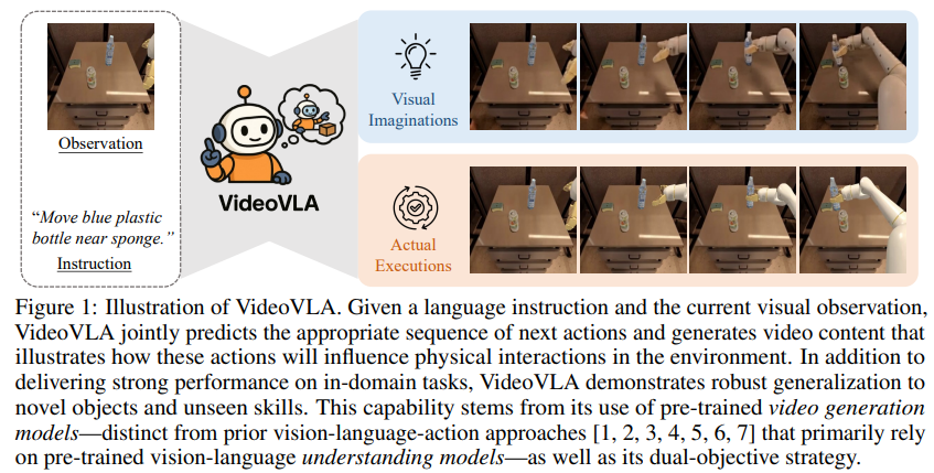 视频生成模型从海量真实世界视频中学习了物理合理性与场景动态规律,其处理新颖文本 / 视觉输入的泛化特性,与机器人应对未知指令、未知观测的需求天然契合。VideoVLA 通过改造视频扩散 Transformer,新增动作输出模态,实现 "语言指令 + 当前视觉→动作序列 + 未来视觉" 的端到端预测。