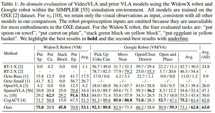 VideoVLA 从域内性能、泛化能力两大维度,在仿真(SIMPLER 环境)和真实世界场景中开展验证,核心结果如下: