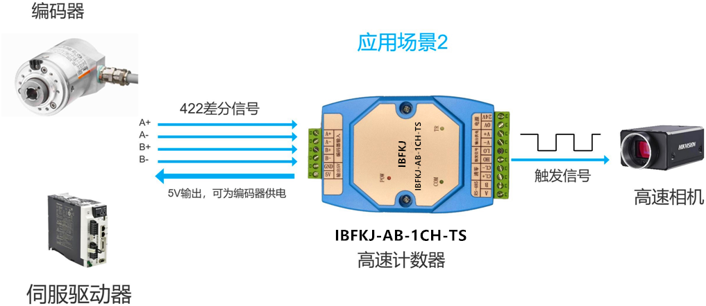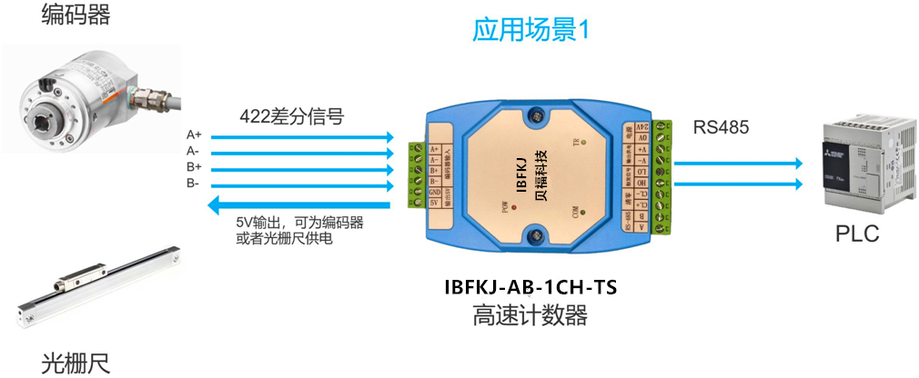 1) 应用场景 1:PLC 需要读取光栅尺或编码器的位置,但是 PLC 的计数器频率一般低于 100K,如果使用高分辨率的光栅尺或编码器时可能超出 PLC 计数上限频率,此时通过IBFKJ-AB-1CH-TS可以完成高速脉冲计数,并通过 RS485的方式把数据反馈给 PLC。